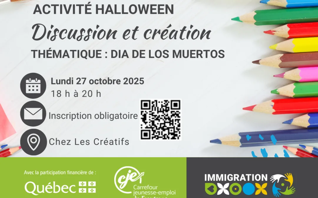 Viens pratiquer ton français dans une ambiance créative et décontracté sous la thématique : Dia de Los Muertos ! À travers des activités artistiques variées (peinture, collage, bricolage, écriture créative…), tu pourras discuter avec de nouvelles personnes dans un climat détendu. Un atelier idéal pour progresser en français tout en laissant libre cours à ton imagination!