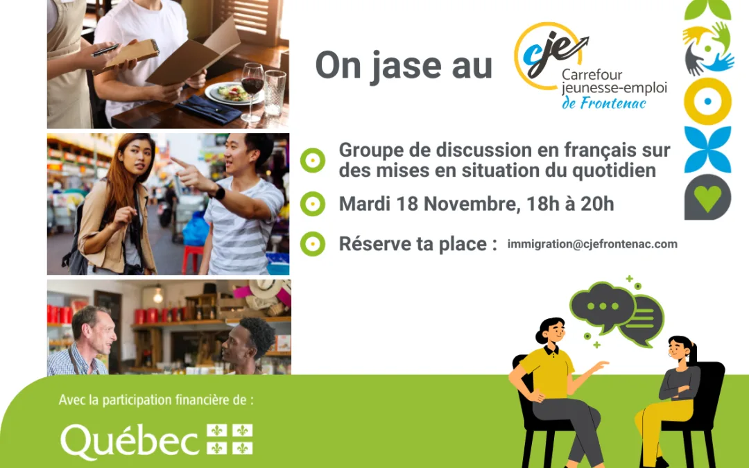 Viens pratiquer ton français dans un atelier de conversation dynamique et accessible! À travers des mises en situation concrètes de la vie de tous les jours — comme aller au restaurant, demander des directions, faire des courses ou prendre un rendez-vous — tu pourras échanger avec d’autres personnes, enrichir ton vocabulaire, partager ton point de vue et améliorer ta compréhension du français dans un contexte concret et pratique.