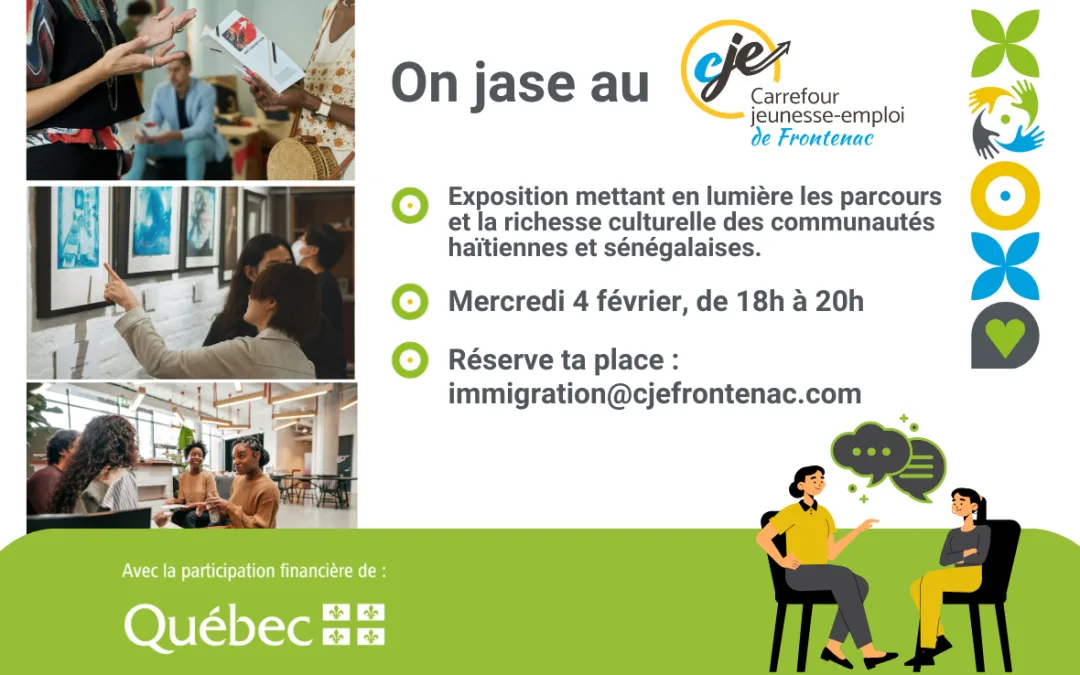 Viens pratiquer ton français lors d’une visite à la station des arts de Thetford ! Dans le cadre de l’exposition collaborative mettant en lumière les parcours et la richesse culturelle des communautés haïtiennes et sénégalaises, cette visite vous permettra d’échanger avec d’autres personnes simplement. L’objectif est d’enrichir ton vocabulaire, partager ton point de vue et améliorer ta compréhension du français dans un contexte concret et pratique.